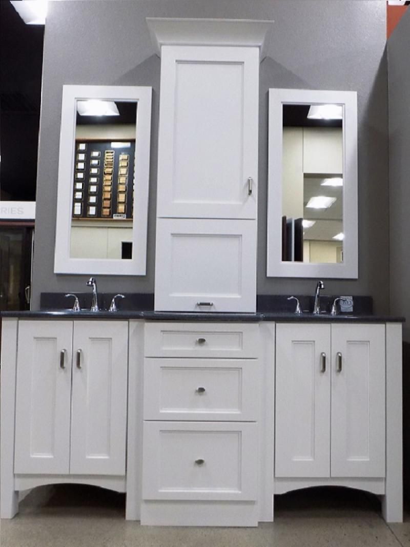BathShowplace mirrors and cabinets, Onyx Collection countertop in Gunmetal with white Olympic bowls and Delta chrome faucets |  BathShowplace Wood Products maple cabinets in Breckenridge door style with Midnight character stain finish. The Onyx Collection Blizzard gloss smooth flat edge countertop with Olympic bowl. |  BathShowplace Wood Products maple cabinets in Breckenridge door style with Midnight character stain finish. The Onyx Collection Blizzard gloss smooth flat edge countertop with Olympic bowl. |